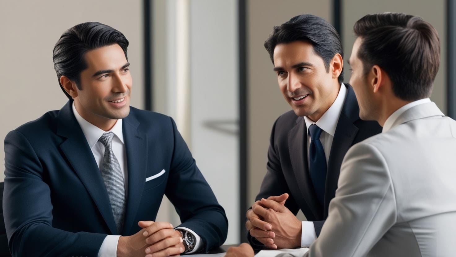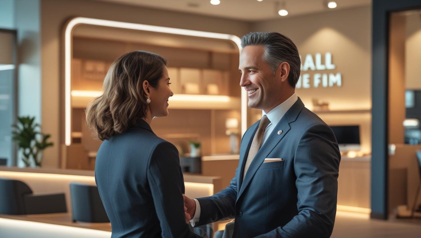 A franchise broker and franchisees shake hands on a deal.